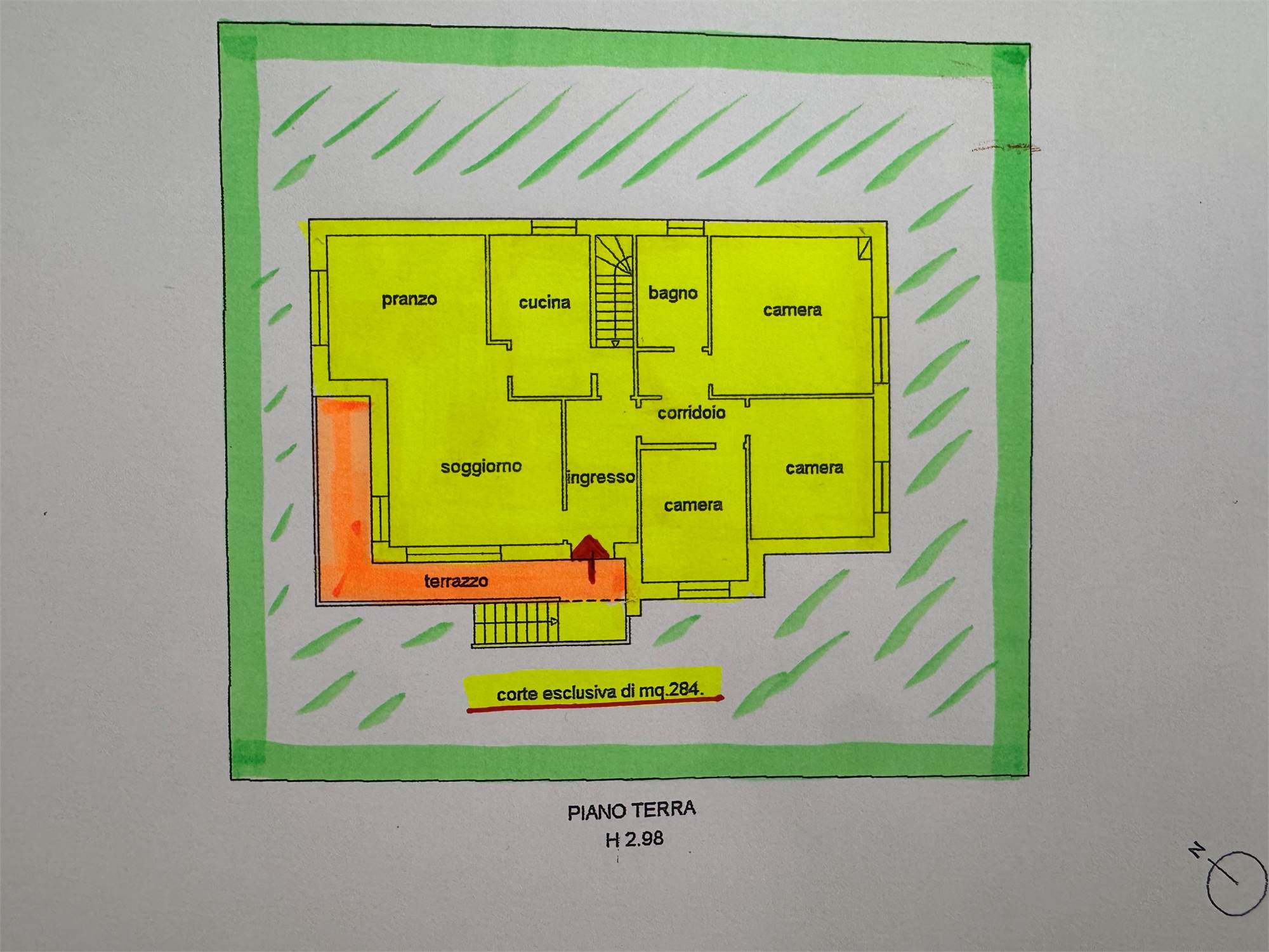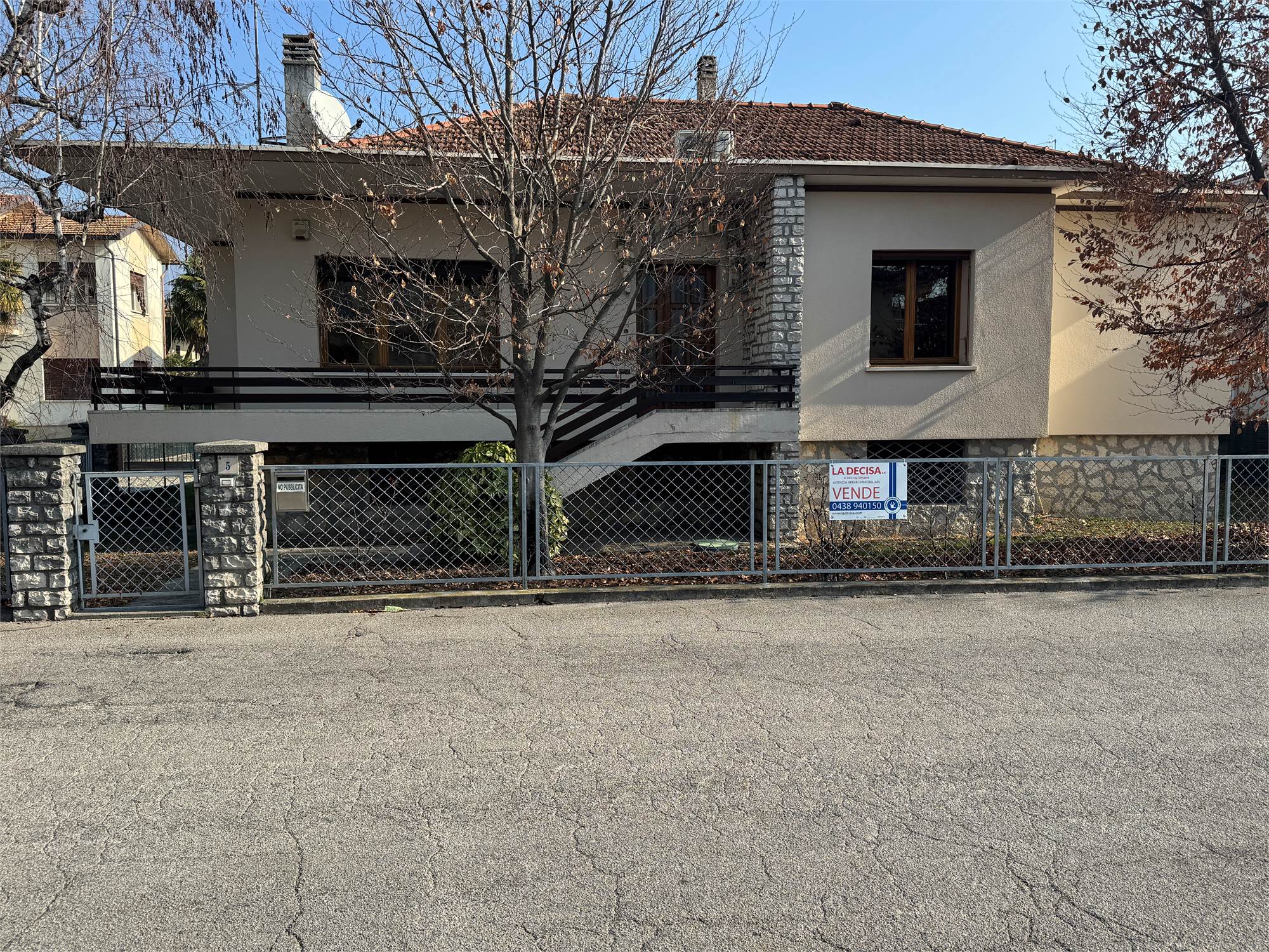 L'abitazione principale si sviluppa al piano rialzato - misura circa 150 mq. - con l'entrata, l'ampio soggiorno sala da pranzo separato dalla cucina abitabile, 3 camere da letto, un bagno finestrato con la vasca ed il terrazzo; tramite la scala interna si accede al piano sottostrada - misura circa 100 mq. - con una splendida taverna con caminetto, la lavanderia, un bagno, la cantina, la C.T. ed una stanza di deposito finestrata; GARAGE con basculante motorizzato di 46 mq. GIARDINO di 284 mq.